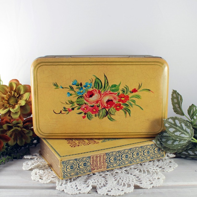 【品番】K-2 【ヴィンテージ】花柄 黄色 ティン缶 ノスタルジックな花柄が描かれた、黄色のヴィンテージティン缶です。 蓋の側面に「Gesetzl Gesch」の文字が入っており、全体的に亀裂のようなデザインが施されたアンティーク調の雰囲気があります。 蓋の側面に凹み、側面に凹凸があり、ステッカー剥がし跡、サビや塗料の剥がれも見られます。ヴィンテージならではの味わいとして楽しめるコンディションです。 小物の収納やアクセサリー入れとしてぴったりのサイズで、ディスプレイにもおしゃれに活用できます。 【コンディション】★★★☆☆ ステッカーの跡あり。凹凸、サビ、塗料の剥がれあり。 【サイズ】 21.2cm × 12.7cm H 約8.5cm 【重量】 285g 【製造】 不明 ※ヴィンテージ品のため、経年による小さな使用感があります。ご了承のうえご購入ください。 【発送について】 こちらの商品はスイスより国際郵便にて発送いたします。 お届けまでに通常よりお時間をいただく場合がございます。あらかじめご了承ください。 発送および配送に関する詳細につきましては、当ショップのショッピングガイドをご確認ください。 【ご注文時のお願い】 国際配送の都合上、お手数ではございますが、備考欄にお届け先受取人様の氏名をローマ字表記にてご記入くださいますようお願いいたします。