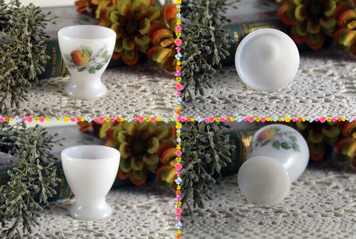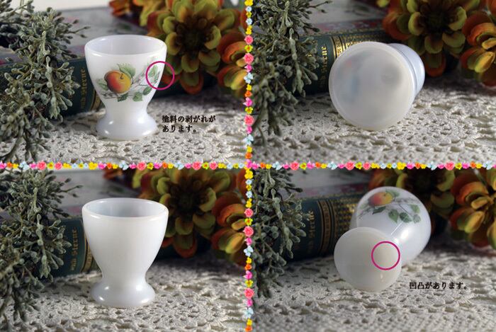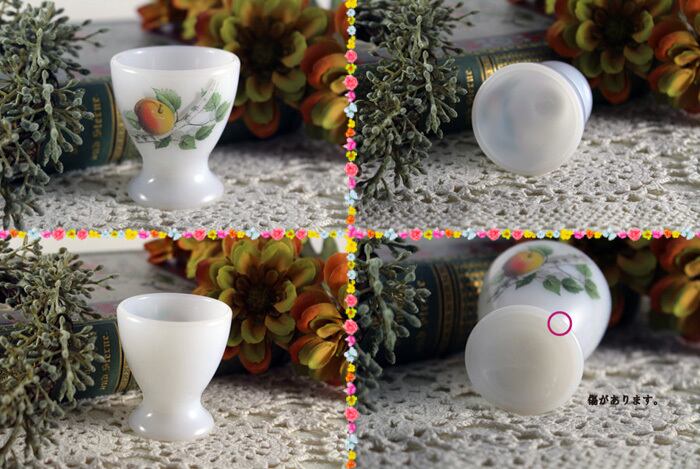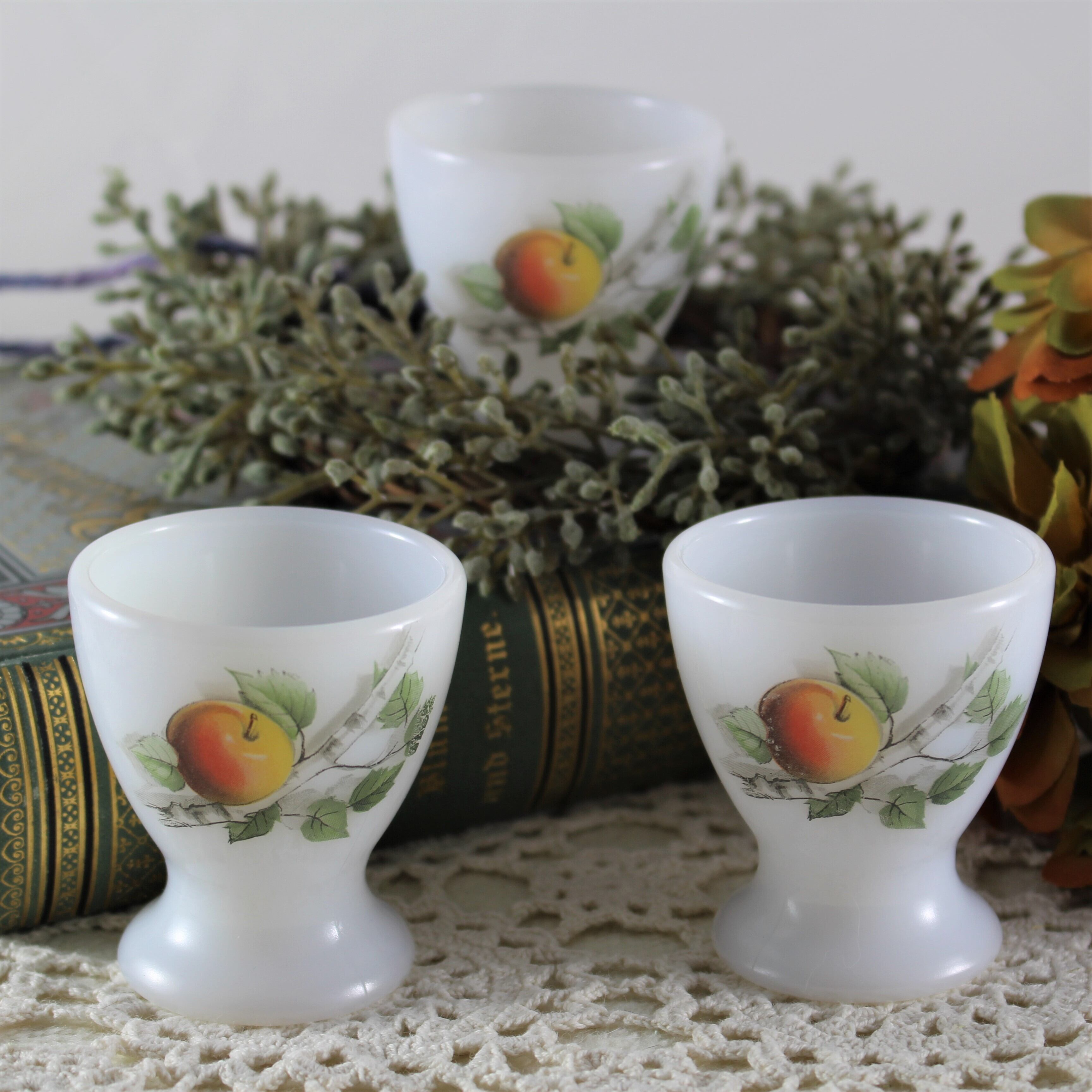 フランス製“ARCOPAL(アルコパル)”の製品と思われるリンゴ柄のエッグカップ3個セットです。