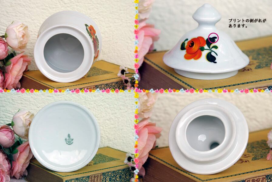 シュガーポットは、蓋の絵柄にほんの少しスクラッチがあり、後ろのロゴマークが少し薄くなっています。