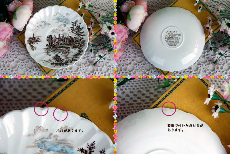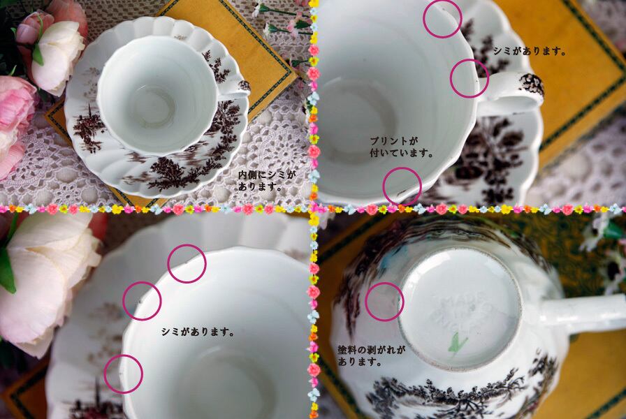 ソーサーはそれほど使用感はありませんが、ほんのわずかに表面に汚れがあり、良く見ると周りの縁にはとても細かいチップが数か所あります。
