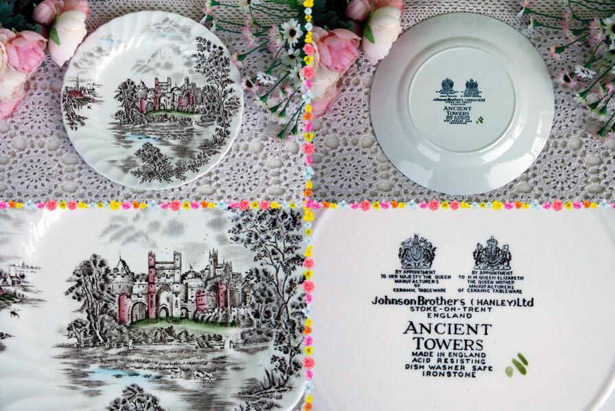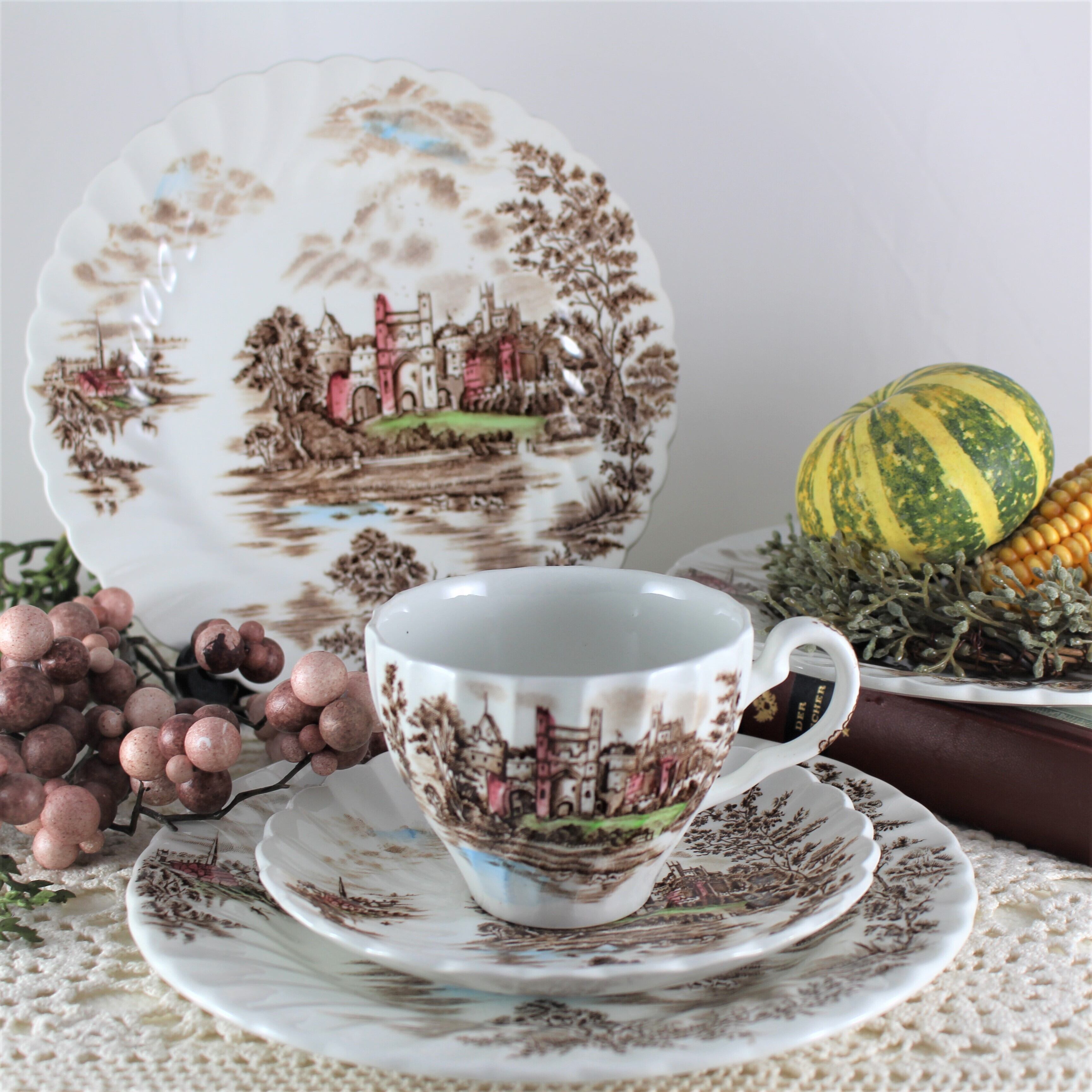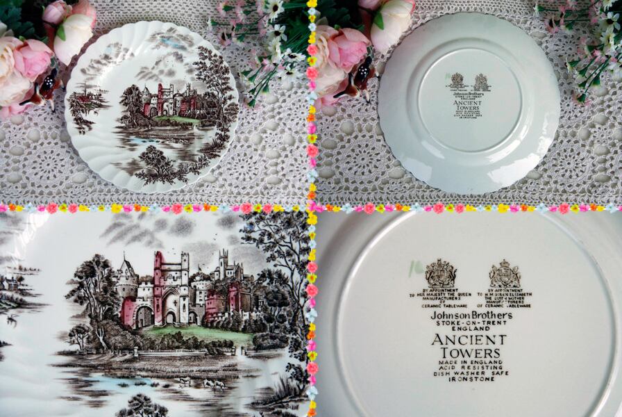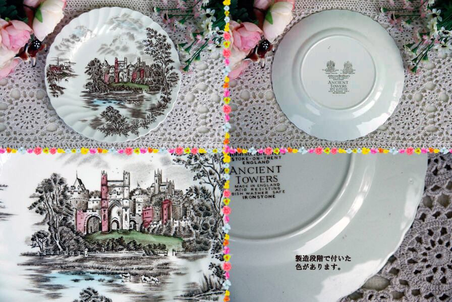 イギリスの老舗メーカー“JOHNSON BROS(ジョンソン・ブラザーズ) 'Ancient Towers'”のカップ&ソーサー1客とデザート皿3枚のセットです。