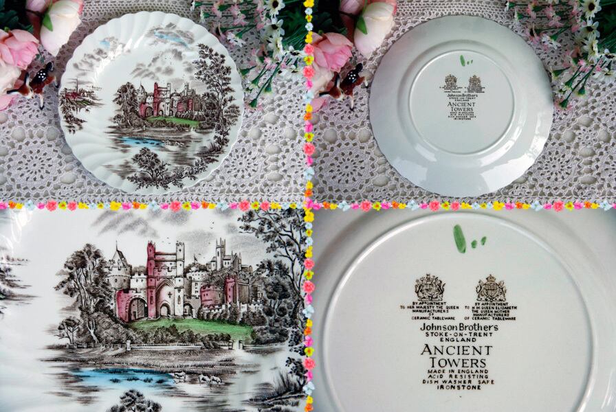 ソーサー、デザート皿はそれぞれ後ろに製造で付いた傷とJohnson Brothersのロゴマークが入っています。