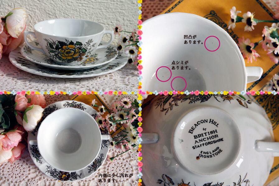 黄色いお花が鮮やかで可愛らしく、スープカップは前後に同じ絵柄が入っています。