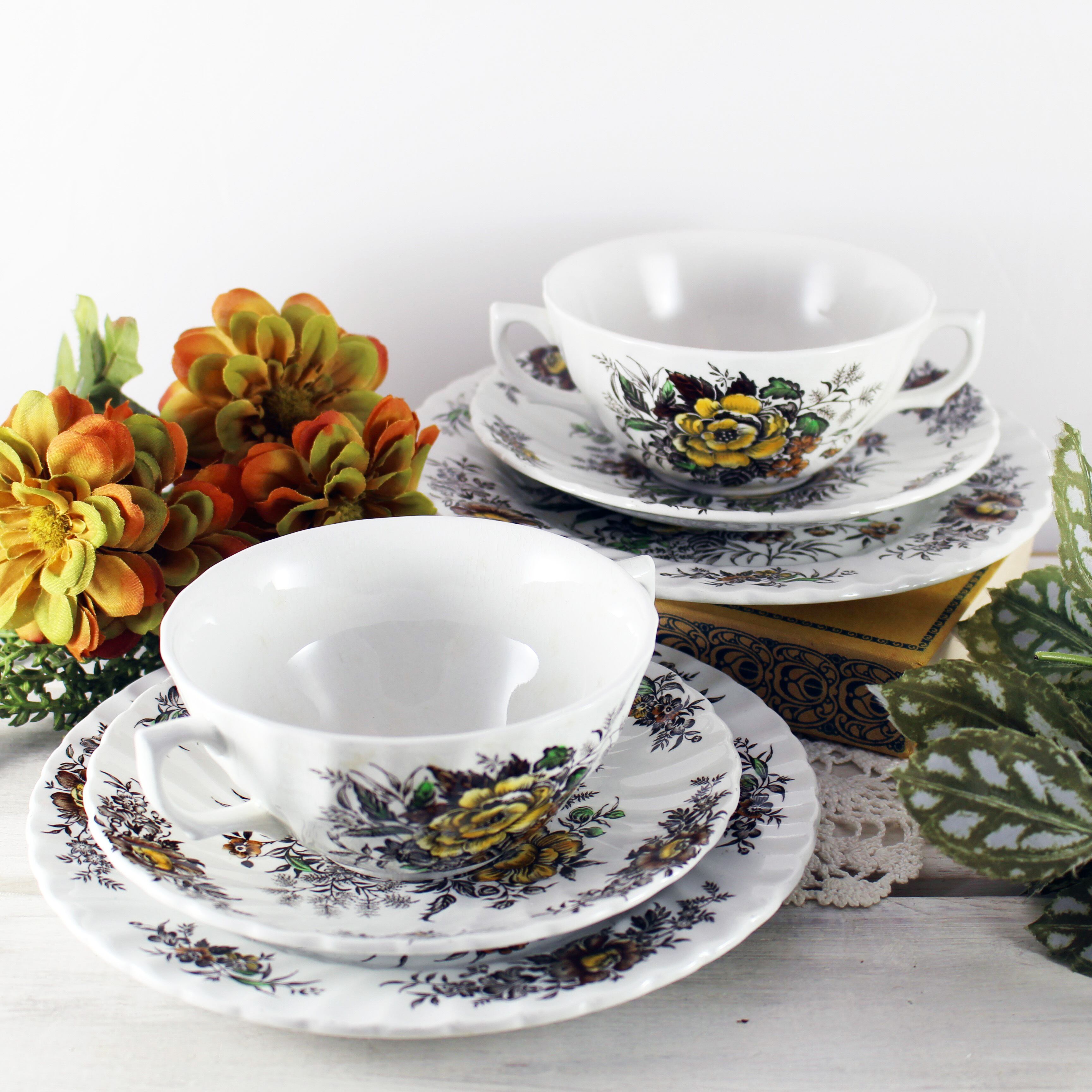 British Anchor” Beacon Hillパターンのスープカップ&ソーサー&デザートプレート3点セット2客です。