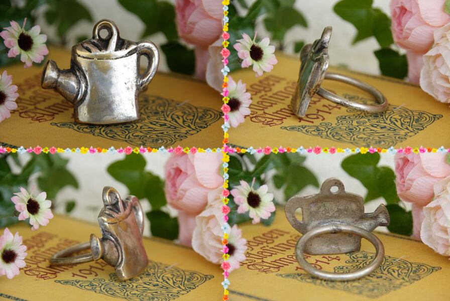 こちらのポット型のリングは元々、金色のデザインだったようですが、色が剥げてシルバーとゴールドが混ざった色合いになっています。
