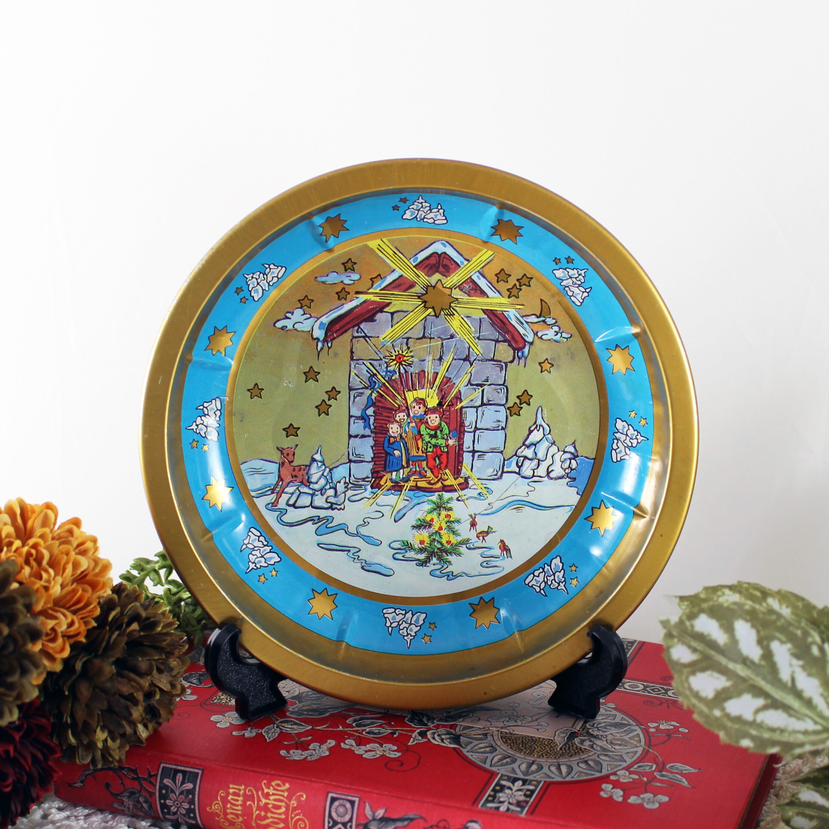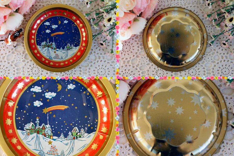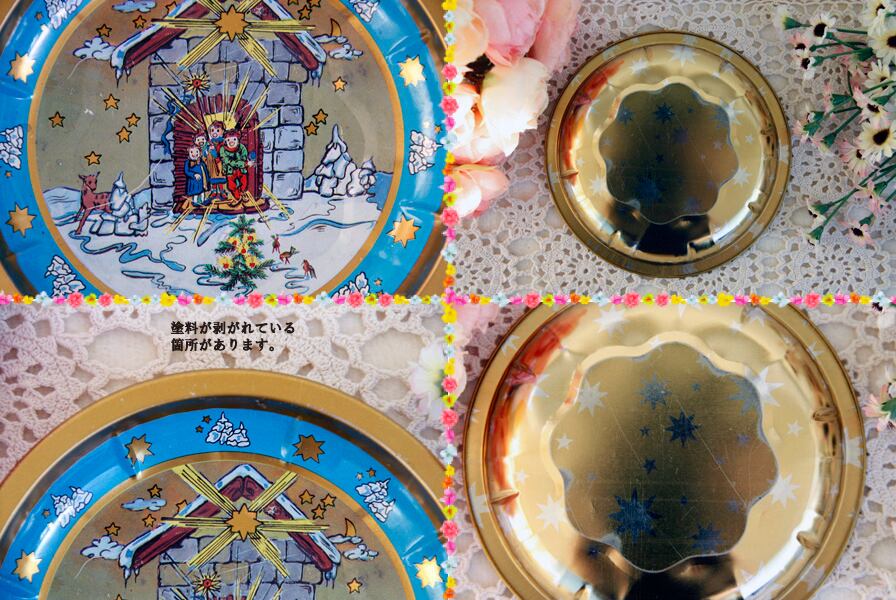 赤い方のトレイには流れ星が流れる冬の夜の風景が、青いトレイには小屋の中で喜んでいる人たちのイラストが入っています。